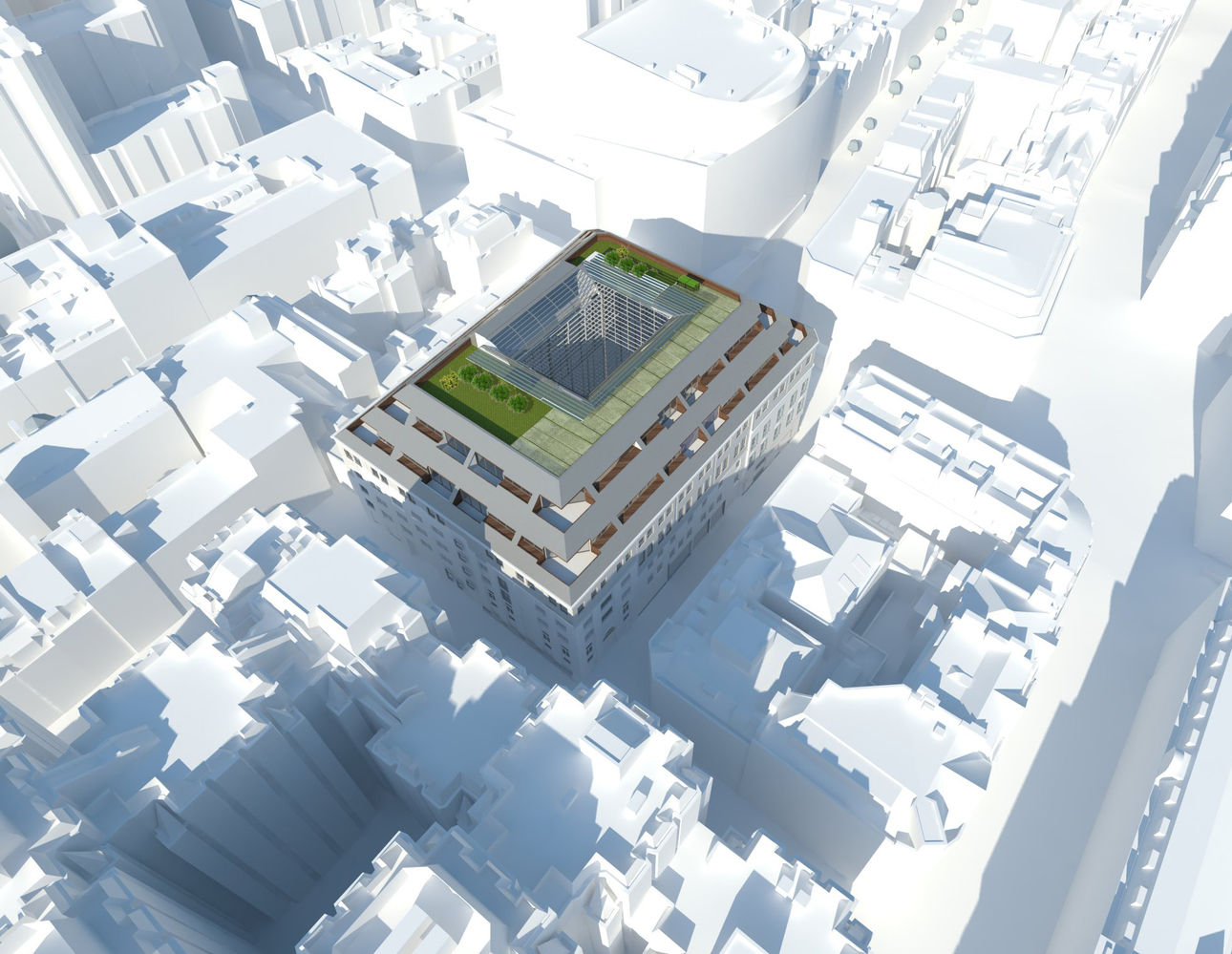 In contrast to competing designs our scheme proposes the retention of all of the existing building facades over which a complete new ‘parapet storey’ is constructed unifying the disparate elevations across the site and reflecting the comprehensive redevelopment and change of use within — while minimising the planning risk within the conservation area.
